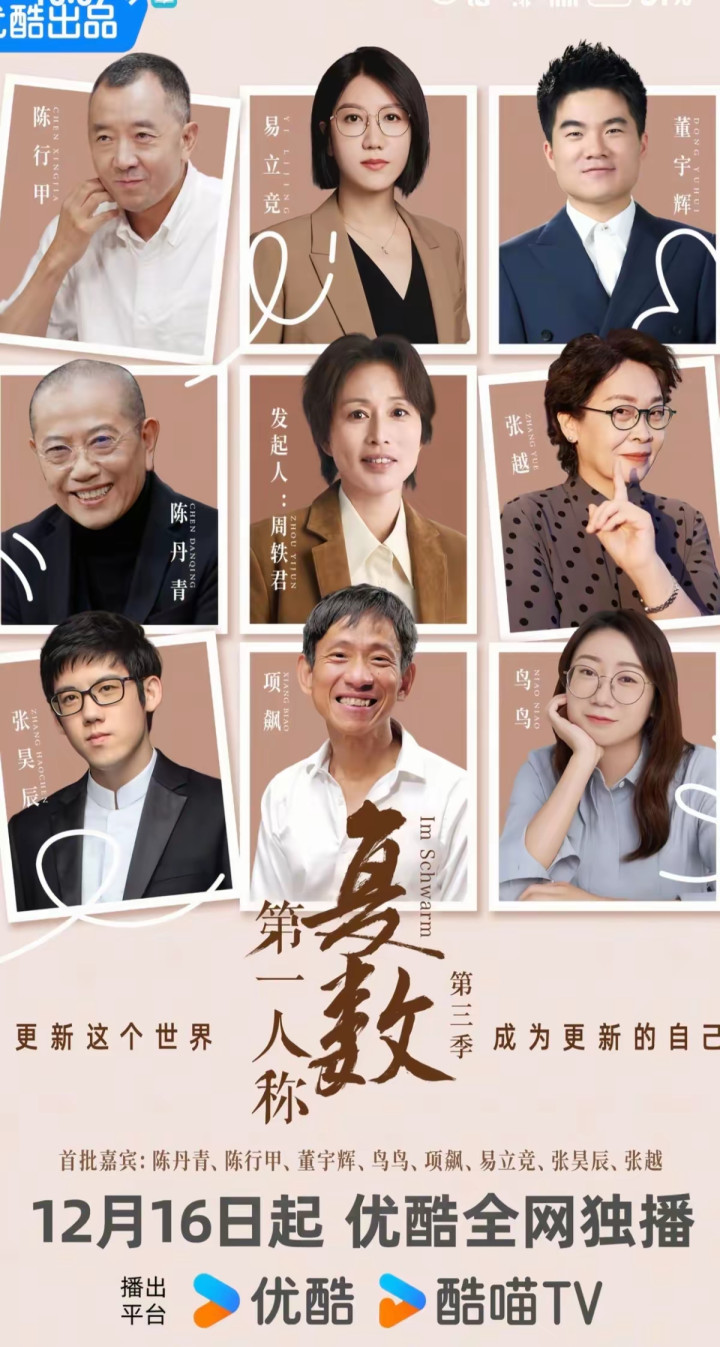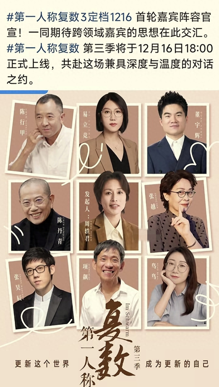 12月10日,就在董宇辉当天晚上即将开启“双12大促”活动上播时,有一件关于他的惊喜消息被其它平台曝光了出来。那就是宇辉将会参加一档由优酷平台的综艺《第一人称复数》第三季,并且在这个官宣海报上还放出了首播时间是12月16日18点的同时,还官宣了这档综艺的全部10位嘉宾,这10位嘉宾可都是各个行业的名人大咖,而且还有两位是宇辉的老朋友。